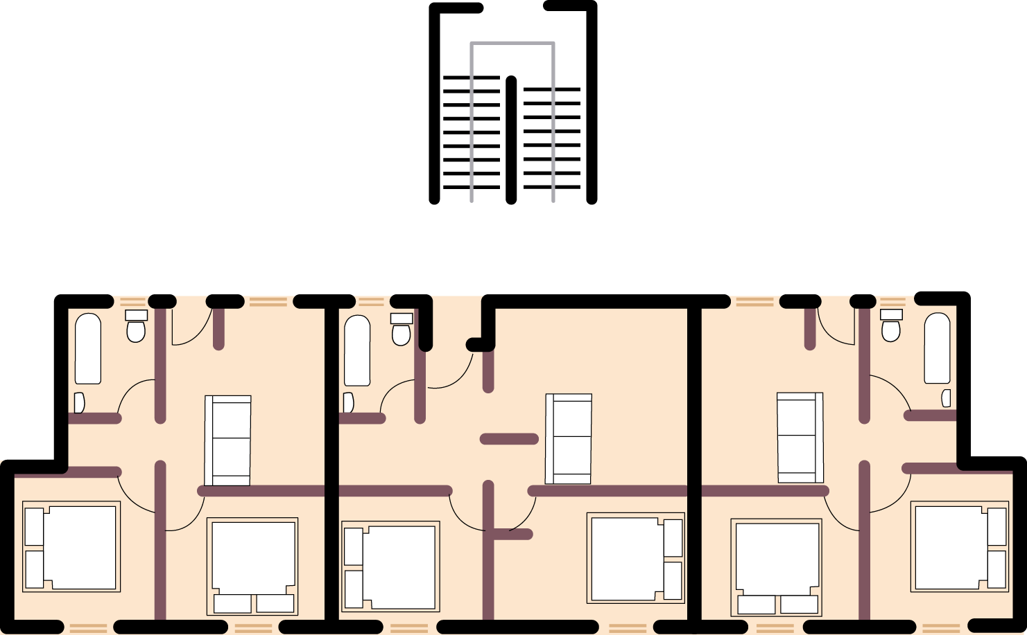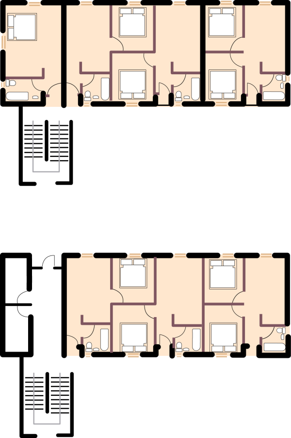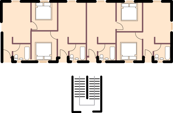 Type E Block consists of 4 one bedroom apartments of 32sqm per floor AND 1 two bedroom apartment of 43sqm per floor. The block is three floors high.
